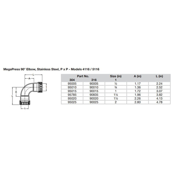 MegaPress 3/4" 90° Stainless 304 Elbow - Double Press Connection - Smart Connect Technology